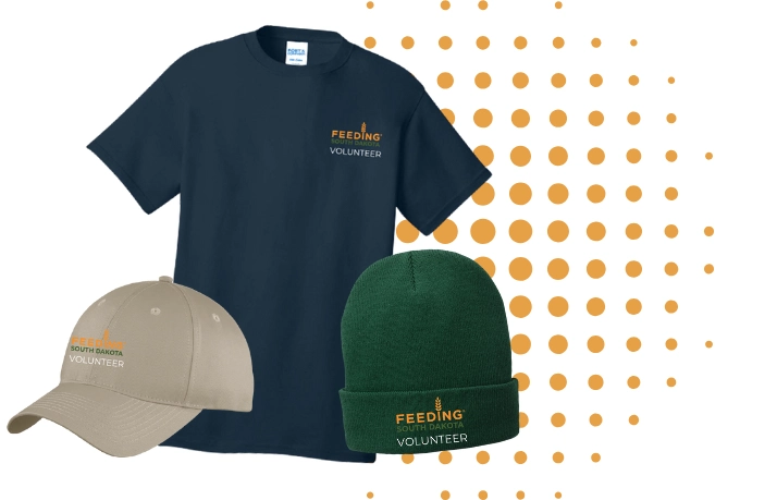Through a partnership with A&B Solutions, the site offers apparel like shirts, sweatshirts, and hats in a variety of colors all sporting an embroidered Feeding South Dakota Volunteer graphic. Order your apparel through the website and thank you for proudly representing our mission! (All purchases must be made through this website. Feeding South Dakota is not responsible for transactions or returns.)